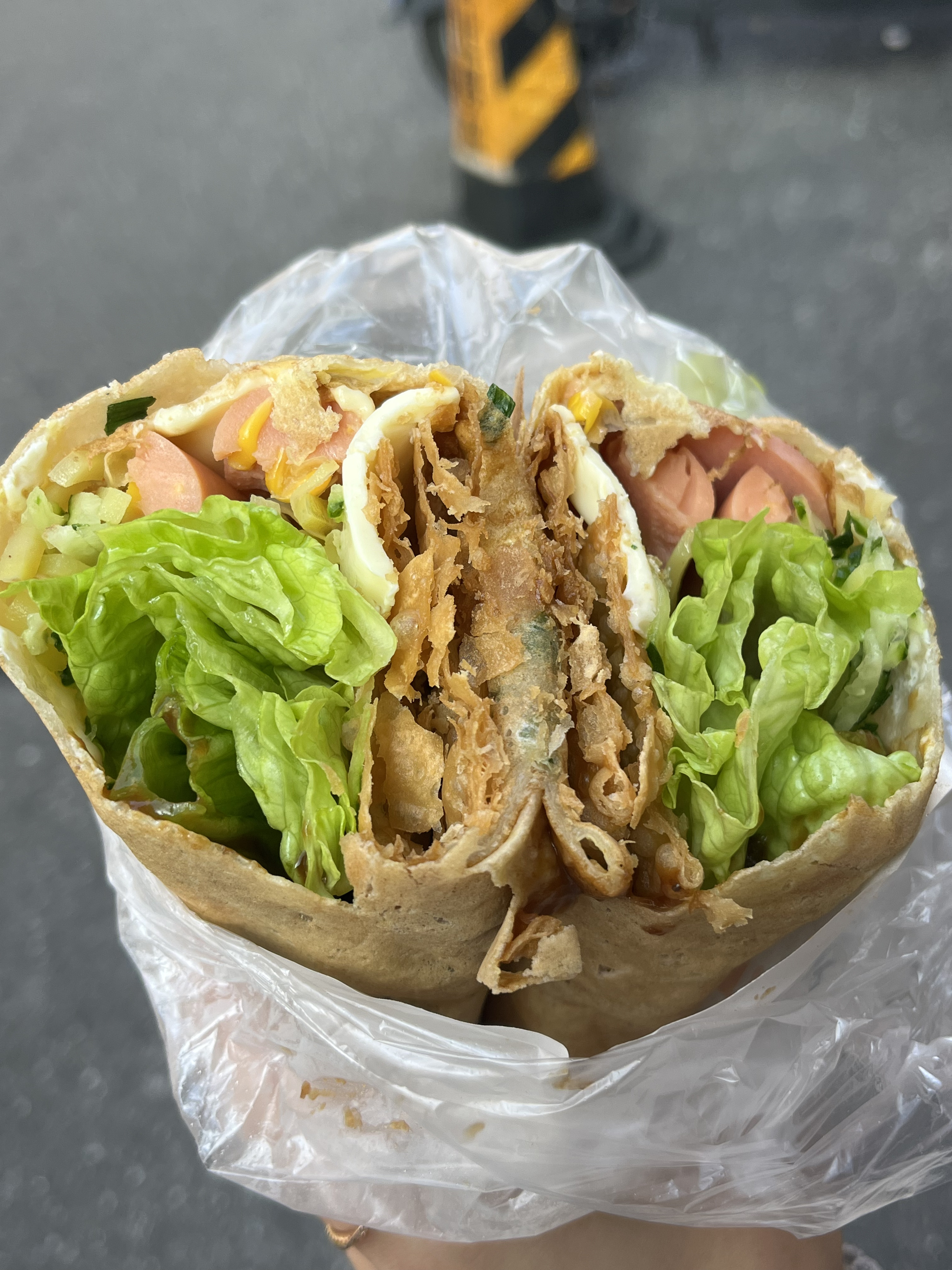 동북인가 지엔빙이 완성된 모습입니다. 무슨 맛일까 상상이 가지 않았는데, 전병이 슴슴한 맛이어서 베이스가 되어 주는 느낌이고 치즈와 소세지가 있어서 간이 맞았습니다. 생긴 것에 비해 약간 짭조름하다고 느끼실 수도 있습니다.
