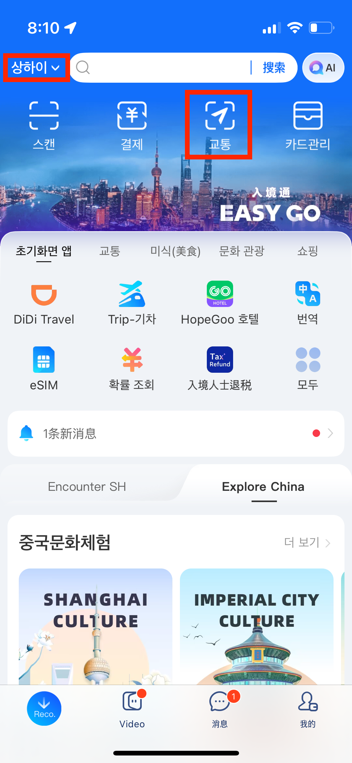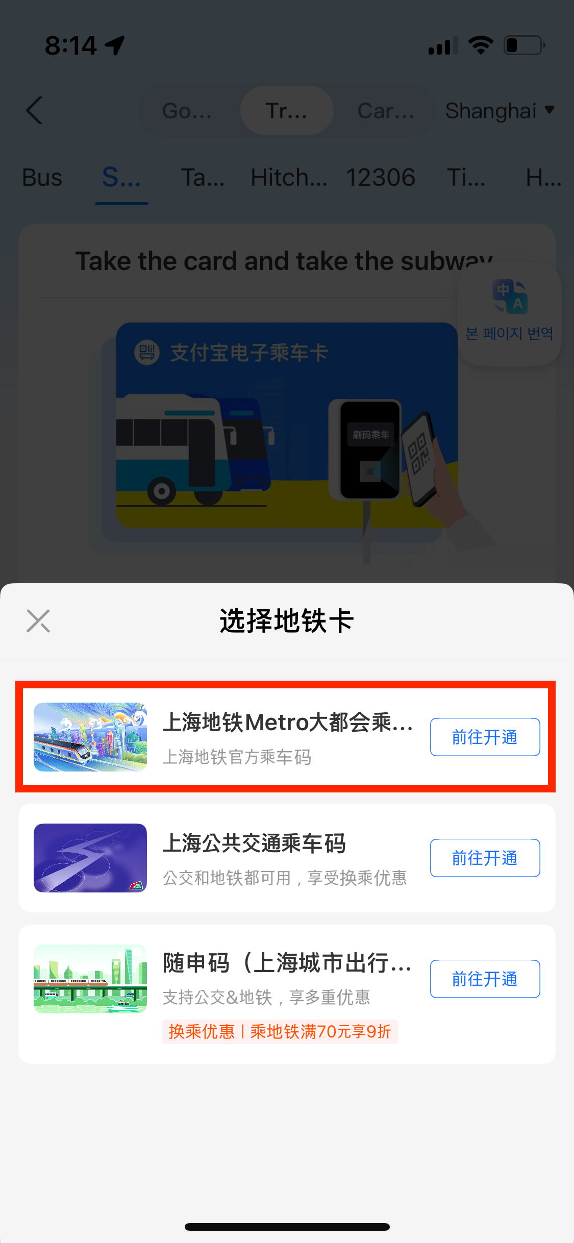 교통을 누르면 위와 같은 화면으로 바뀔텐데요. 이 화면에서도 가장 상단 오른쪽에 있는 지역을 확인해서 영어로는 Shanghai 한국어로는 상하이로 되어 있는지 더블체크 하시길 바랍니다.