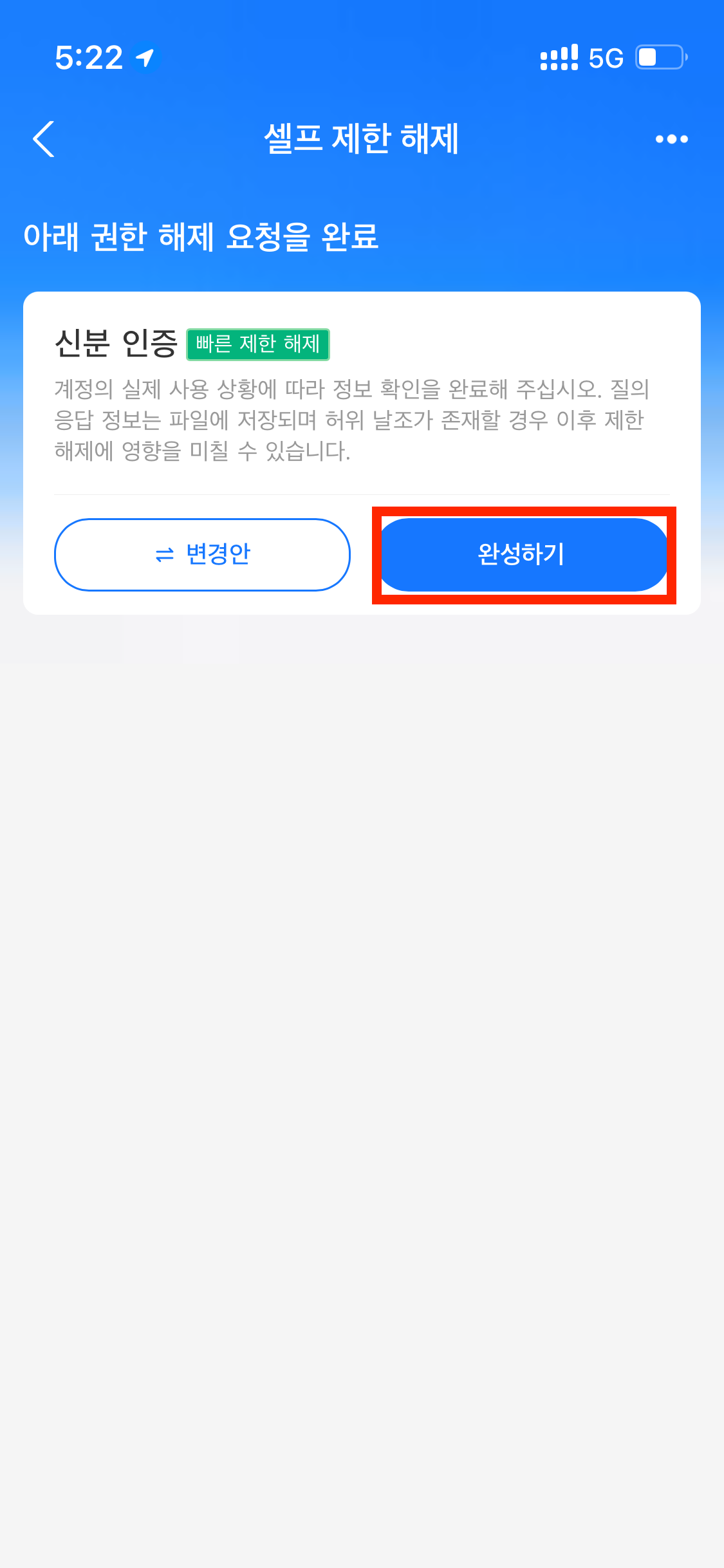 카메라로 충분히 여권을 읽어도 아무 반응이 없기도 했는데, 시간이 지나니 자동으로 제한 해제가 된 것을 확인할 수 있었습니다. 그러니 조바심 가지지 말고 천천히 진행해 보시면 되겠습니다.
