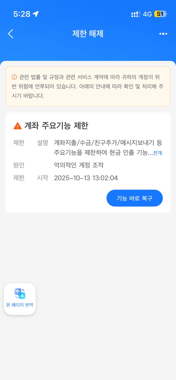 그럼 계좌 주요 기능 제한의 이유와 원인이 나오는데요. 별다른 조작을 하지 않았음에도 위와 같은 사유로 중지가 되어 있더라고요. 중국 상하이 여행 시 저만 이런 일이 발생한게 아니라 함께 간 지인에게도 저와 똑같은 현상이 있어서 더욱 의아했습니다.