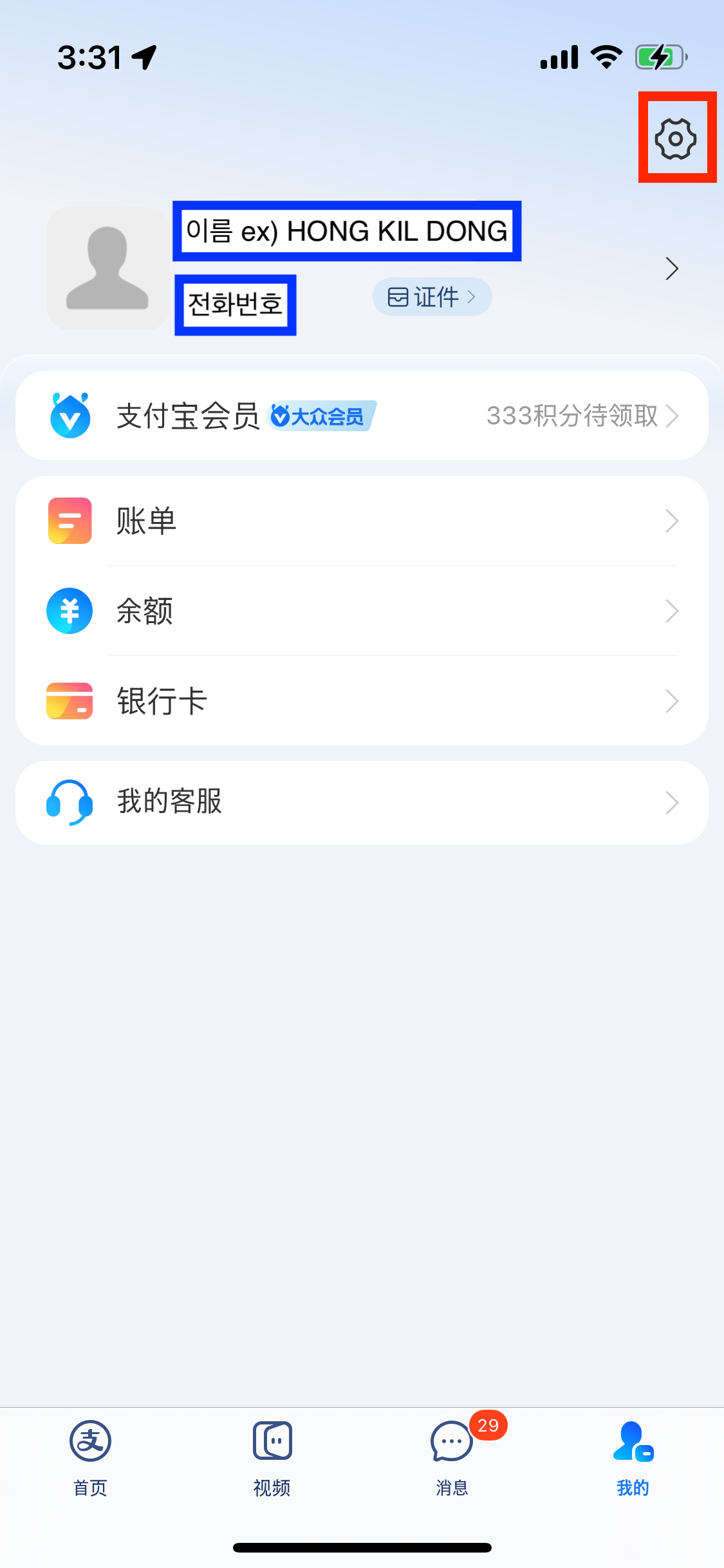 가장 먼저 알리페이를 다운로드 받으신 후, 가입 및 휴대폰 번호 등록을 진행해 주세요. 가입이 완료되고 등록이 완료 되었다면 아래 화면과 같이 개인 설정 창에서 자신의 이름과 아래 자신의 휴대폰 번호가 뜨게 될 것입니다.